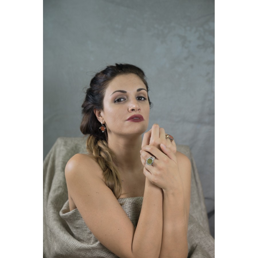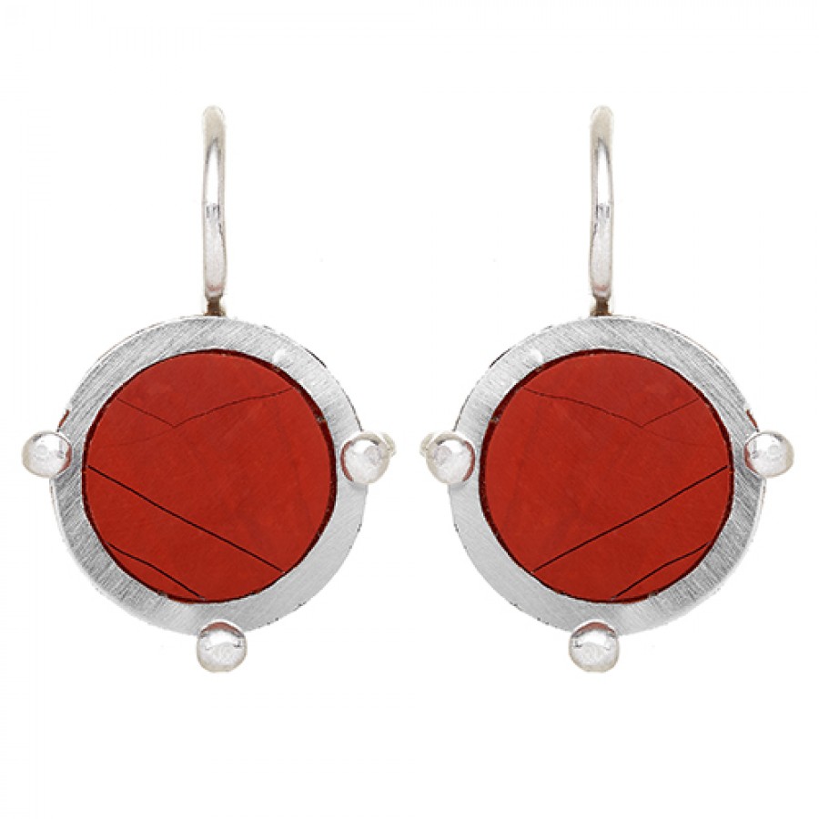 Orecchini in argento 0,925 realizzati con la tecnica della microfusione, castone in ferro, pietra diaspro. Dall’esile montatura in argento che fluisce quasi impercettibile dal lobo, si stagliano sul volto due cerchi rosso fuoco, ornati dalle sferette spiritose delle tre griffe. Il grigio scuro del ferro, contorna la pietra con un abbraccio solido e materico, orecchini forti, pieni di vita, che cercano una donna positiva, ironica e senza timidezze.