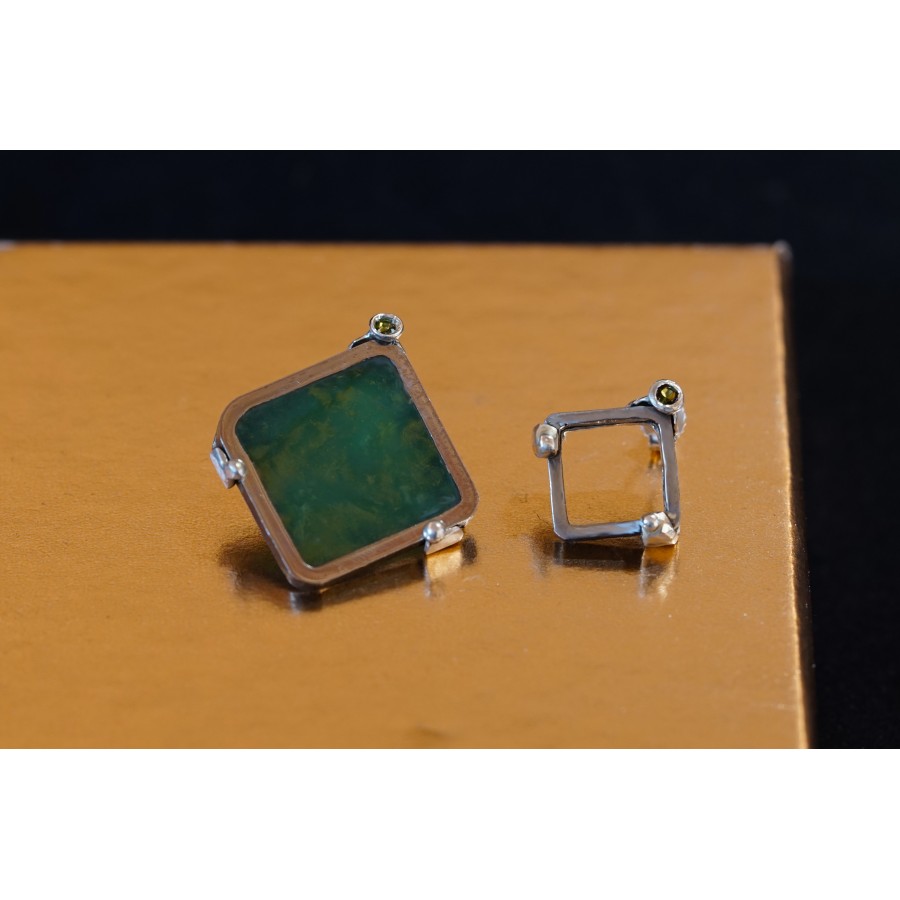 Questi sono gli orecchini che Sara ha scelto per la sua compagna, ha visto il paio originale ( quello grande verde ) qui in studio e insieme abbiamo elaborato questa interpretazione con questa grande asimmetria.