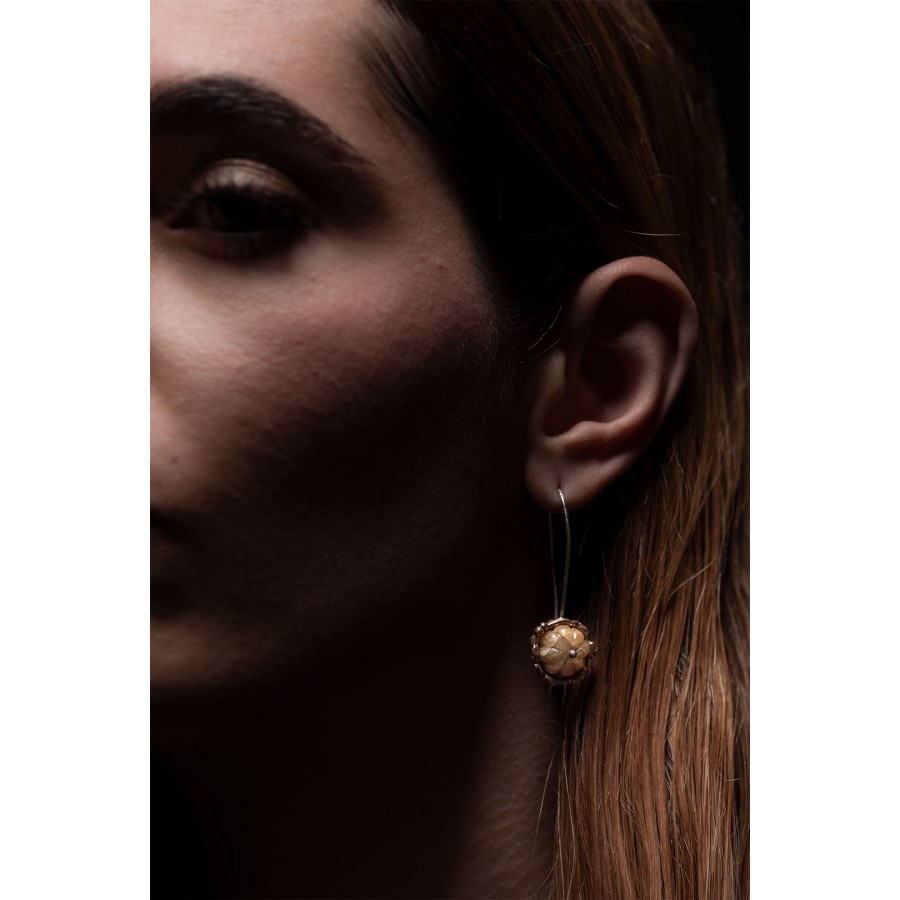 Orecchini in bronzo e argento 0,925 realizzati con la tecnica della microfusione, con pietre incise in forma di spicchi morbidi. Scelta di pietre: acquamarina nel colore  verde o giallo e pietra di luna bianca. La pietra emerge dal nido di bronzo come un tenero boccio di camelia, come una gemma che spunta dal suo ramo a cercare il sole. L'esile amo fa dondolare con grazia gli orecchini dai lobi: si accendono riflessi delicati che illuminano il volto di una luce romantica.